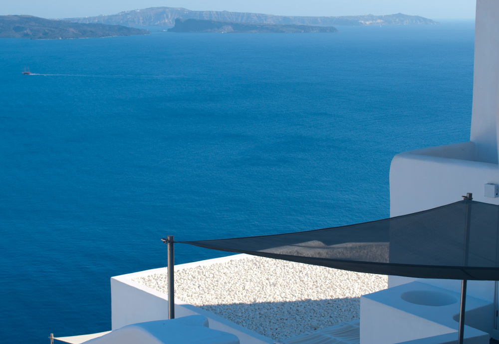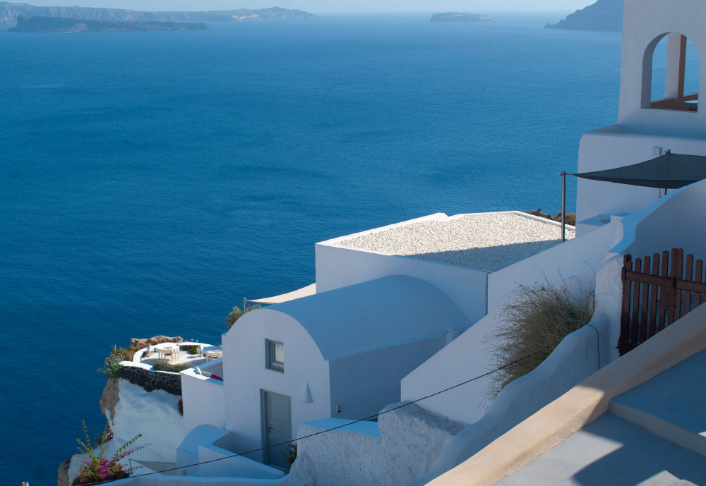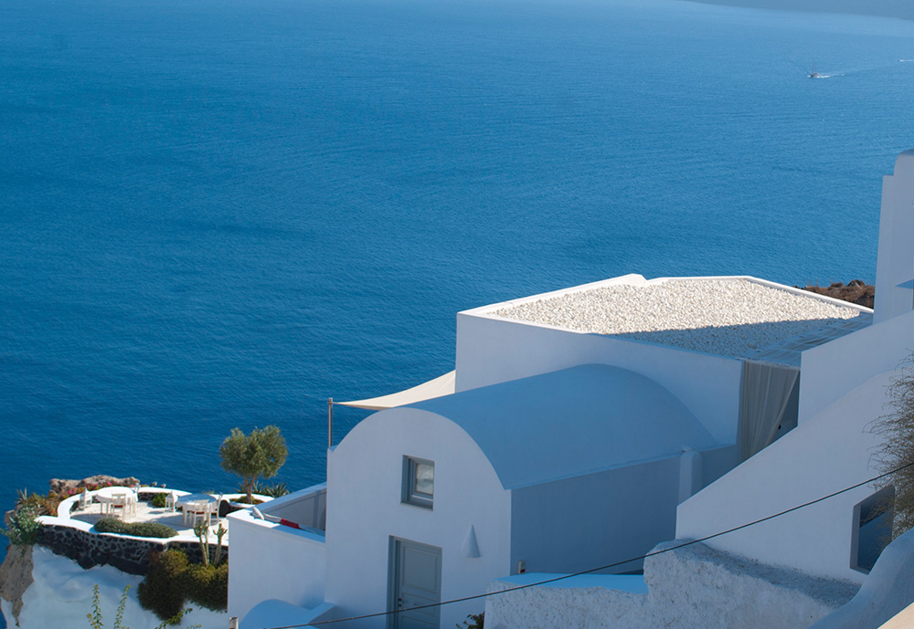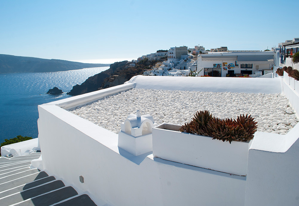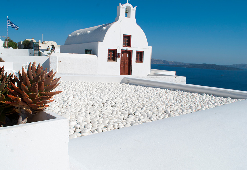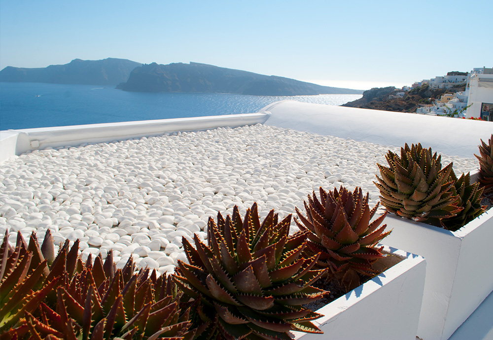 Σε ένα μυκονιάτικο τοπίο που ένα απο τα βασικά χαρακτηριστικά του είναι οι λευκές πινελιές, έρχεται το βότσαλο Θάσου με το δυνατό λευκό του χρώμα να εναρμονιστεί πλήρως σε αυτό . Το κατάλευκο βότσαλο Θάσου χρησιμοποιήθηκε για την επίστρωση ταράτσας της μυκονιάτικης κατοικίας. Εκτός από τον αισθητικό χαρακτήρα που προσδίδει, πρακτικά το λευκό του βότσαλου βοηθά στην αντανάκλαση του ήλιου και την προστασία του κτιρίου από τις υψηλές θερμοκασίες.